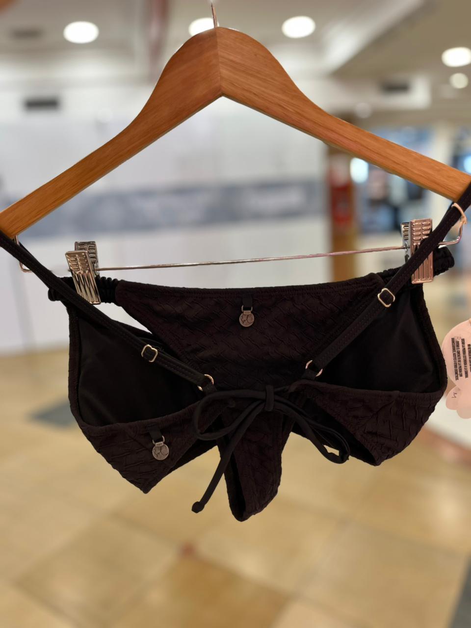 Bikini confeccionada en lycra texturada con aplique de carey resistente en el corpiño. Bombacha arruchada colaless