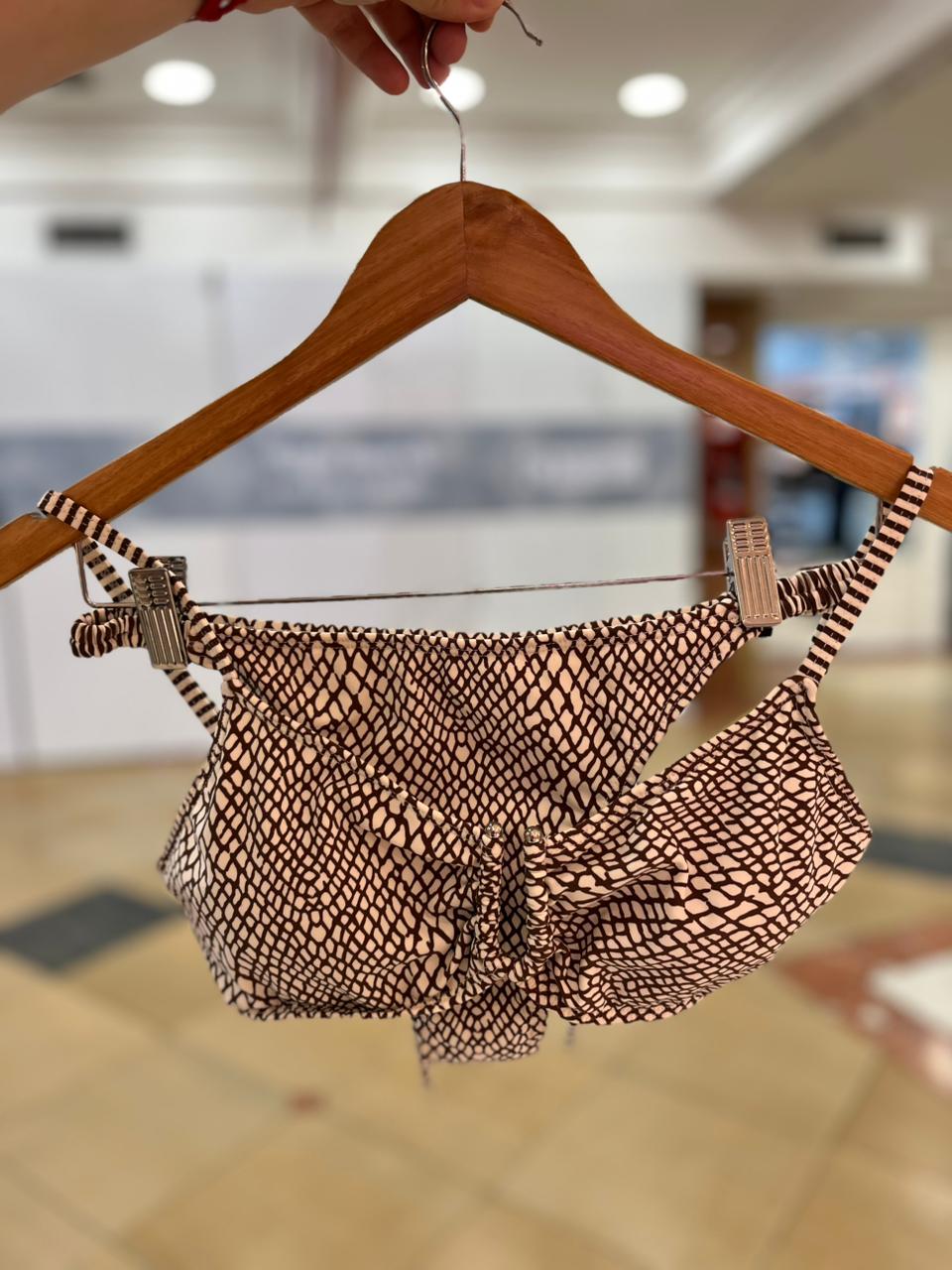 Bikini estampada con herraje, bombacha arruchada colaless