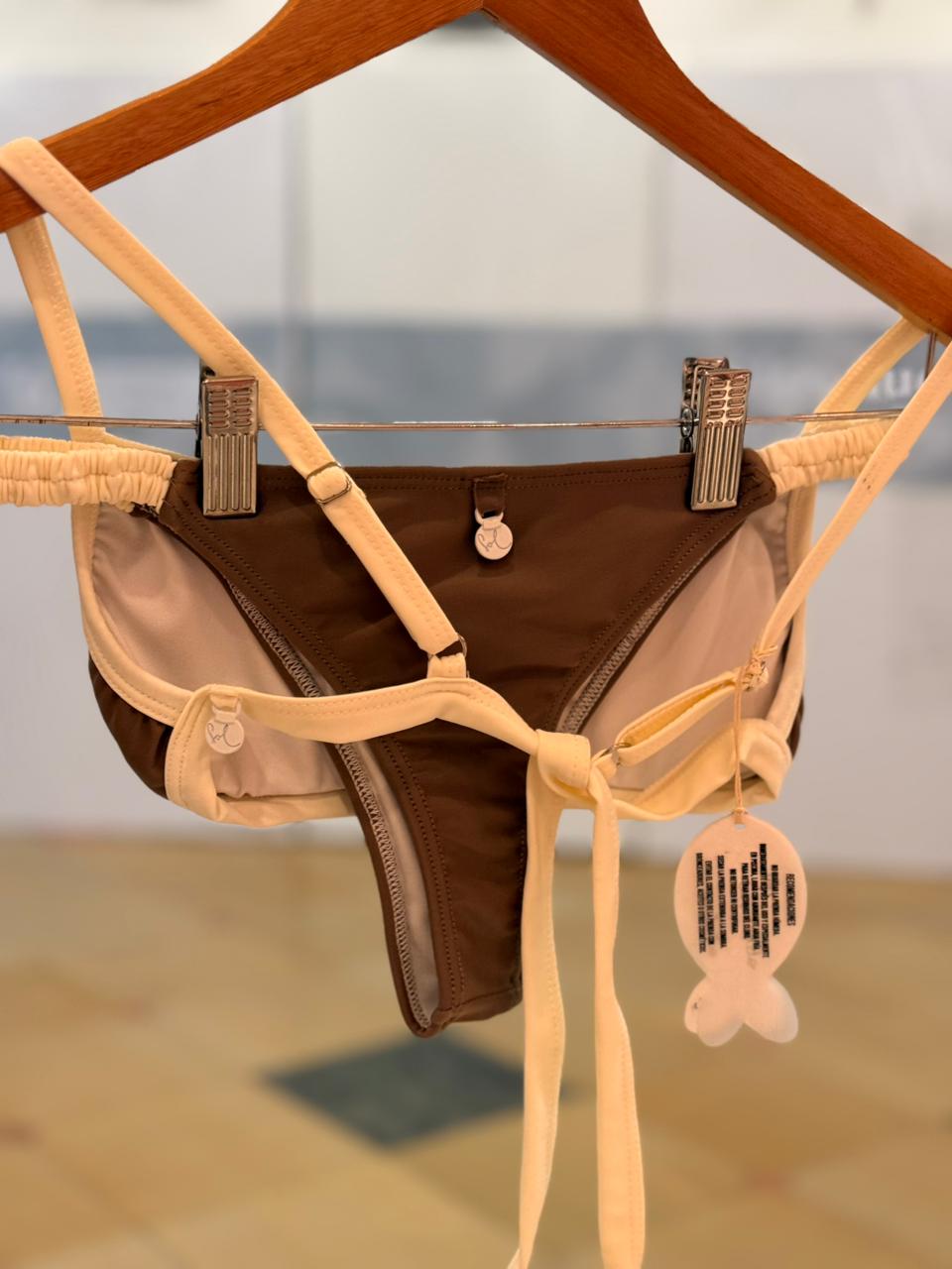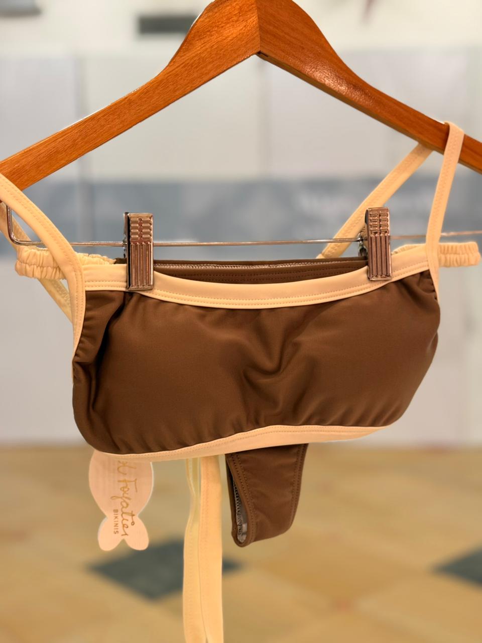 Bikini Top color castañocon bordes en color tiza. Push up desmontable. Bombacha arruchada a los costados, semivedetina.