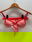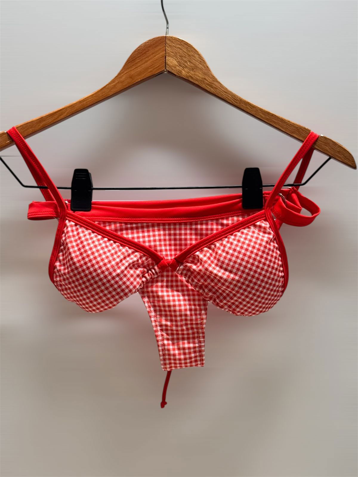 Bikini triángulo estampada, con push up desmontable. Bordes color rojo Bombacha regulable colaless .