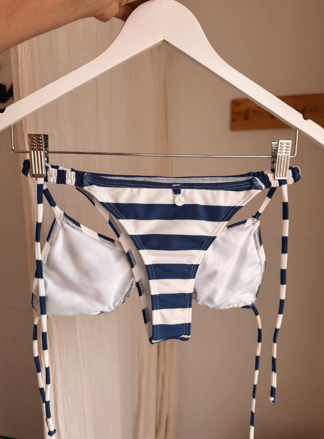 ikini Triangulo estampa rayada náutico. Push up desmontable. Bombacha arruchada a los costados, Bombacha colaless.