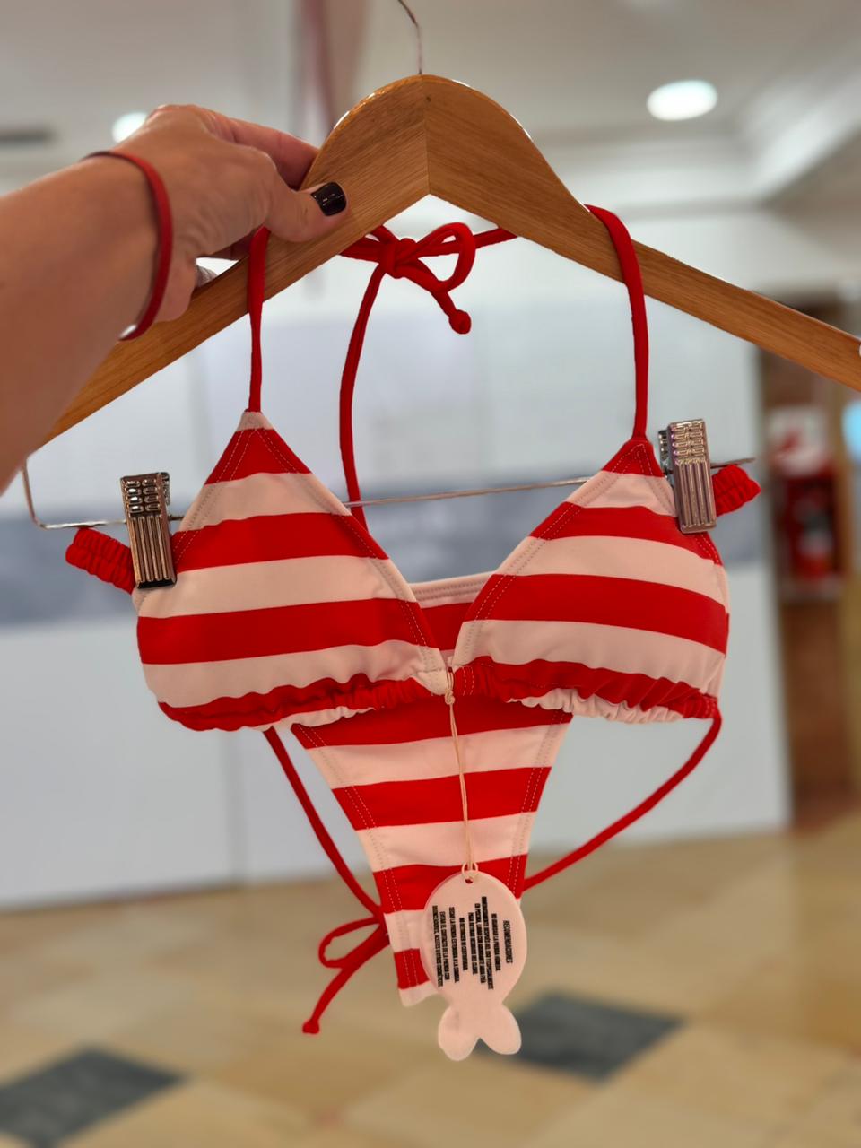 Bikini Triangulo estampa rayada rojo. Push up desmontable. Bombacha arruchada a los costados, Bombacha arruchada colaless.