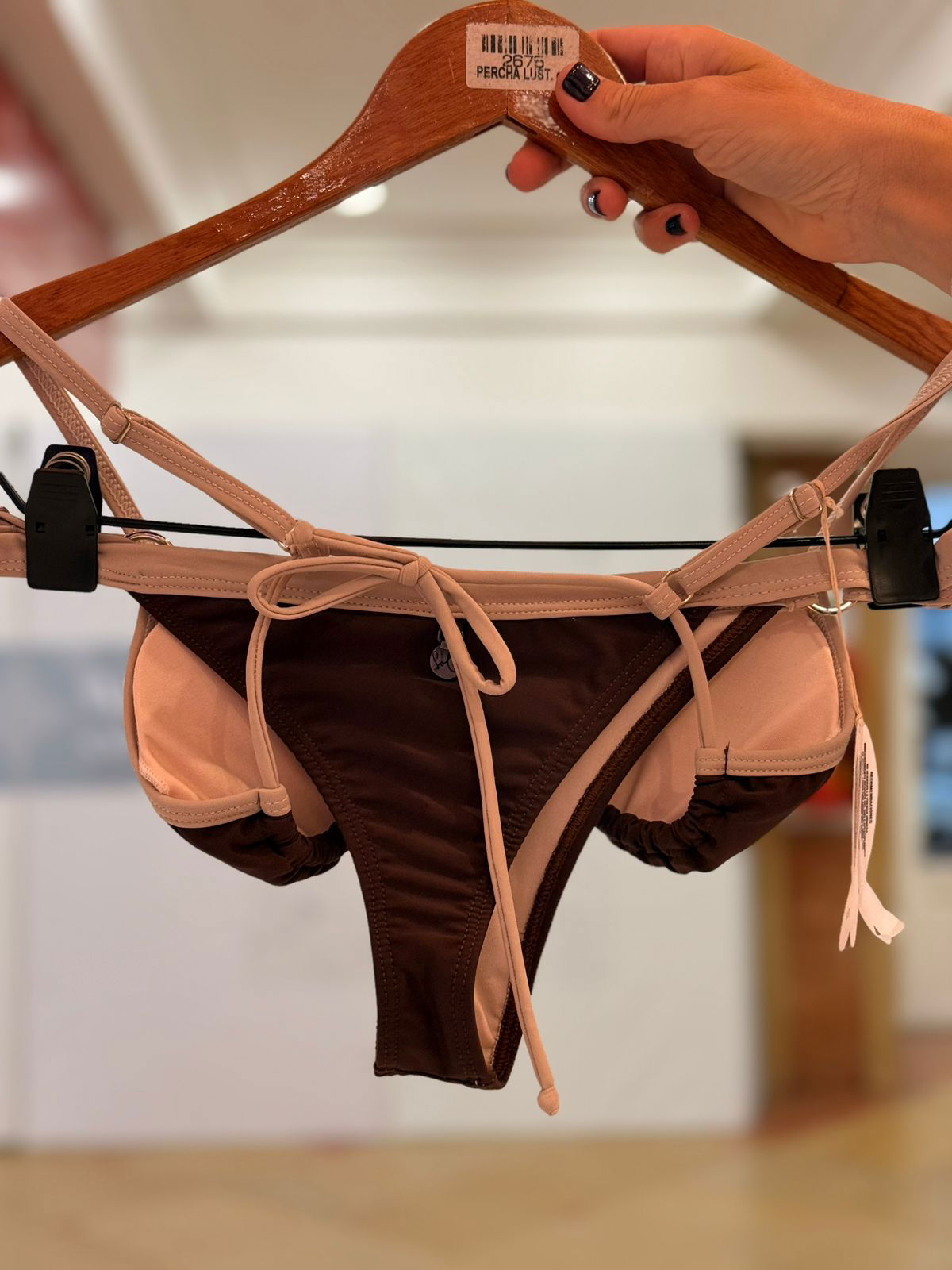 Bikini triangulo movible, lycra chocolate con bordes lisos color nude.