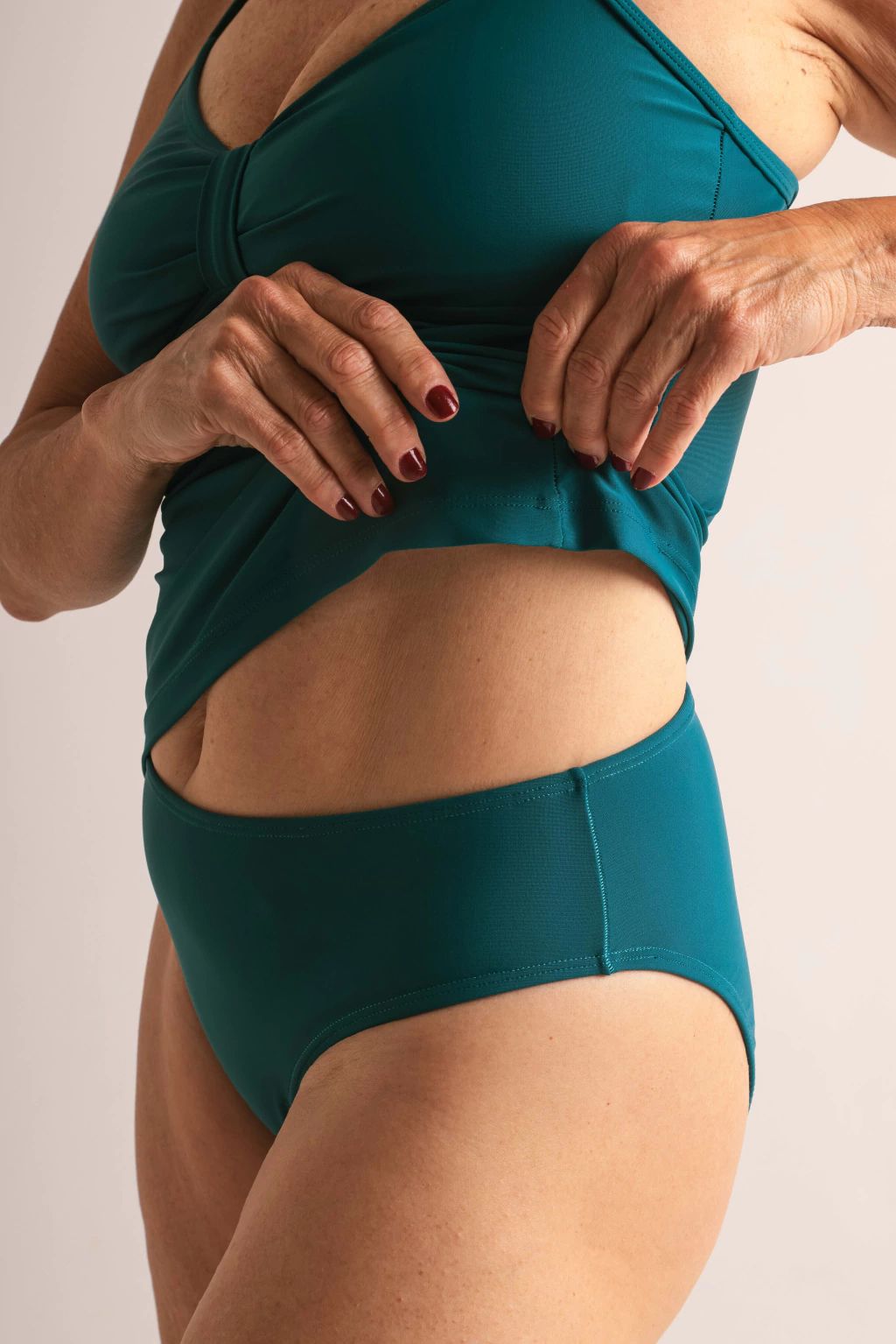 Tankini lisa con detalle de traba en remera y bombacha tiro medio; tiene breteles regulables. Esta integramente forrada. Tiene relleno fijo..